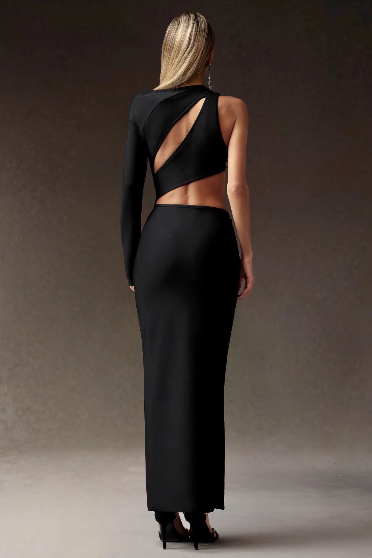 Vestido longo bandagem com fenda, um ombro só e uma modelagem justa com recortes. O tecido elástico no busto, cintura...