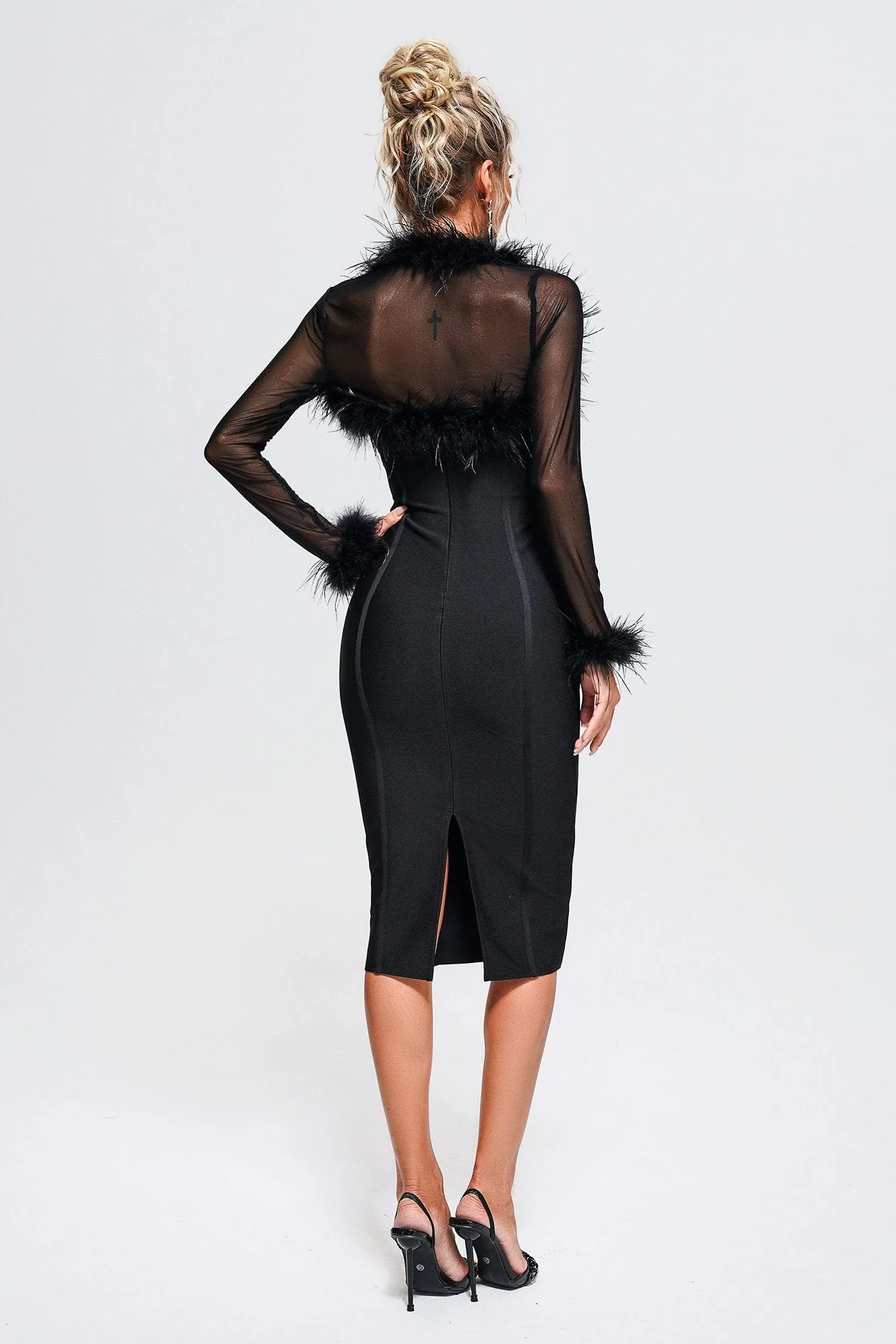 Um vestido bandage elástico feito de tecido grosso com efeito modelador e que afina a silhueta. Este é um vestido...